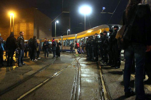 Dazu noch mal NoLegida, welche aktuell einen weiteren Vorfall bereits auf dem Wilhelm-Leuschner-Platz aus ihrer Sicht auf der Facebookseite des Bündnisses monieren: “Die Polizei hatte zwar die Deeskalation ausgerufen, trotzdem kam es am Ende am Leuschner-Platz zu einer krass übergriffigen Szene, als ein Mensch mit seinem Handy über die Menge filmte und daraufhin zu Boden gerissen wurde. Vorwurf: er soll Polizisten fotografiert haben. Danach wurde er meterweit geschleift, auf dem Boden gewürgt, getreten, und schlussendlich mit dem Kopf gegen eine stehende Tram gestoßen. Inzwischen ist er wieder frei und soweit in Ordnung.”