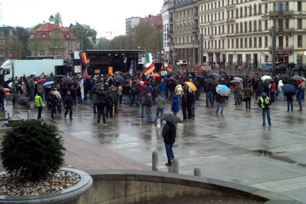 Nach dem “Spaziergang” verspricht Rösler ein “Rednerfeuerwerk” mit dem Neurechten Götz Kubitschek und natürlich Lutz Bachmann. Gegen 19:40 Uhr brechen die Legidateilnehmer zu ihrem Rundgang auf dem Martin-Luther-Ring Richtung Richard-Wagner-Platz auf. Es ertönen wieder die Rufe “Wer Deutschland nicht liebt, soll Deutschland verlassen”. Alexander K. (Die Rechte) befindet sich heute wieder unter den Demonstranten.