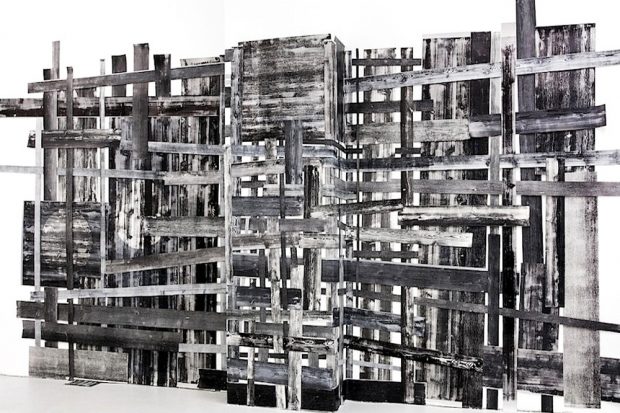 Also gewissermaßen eine ambitionierte Schule des Sehens, eine Einladung zum Entdecken, ohne gleich wieder von bildhaften Gleichnissen überrumpelt zu werden. Wie zum Beispiel in Wolfgang Ellenrieders Holzschnitt auf Büttenpapier „Latten“ von 2012 zu sehen, ein Druck, der in Wirklichkeit 256 mal 389 Zentimeter groß ist. Man steht also als Betrachter tatsächlich der Fiktion eines hohen Lattenzaunes gegenüber, der seine Schönheit freilich auch durch das Provisorische, Zusammengestückelte bekommt – echte Handarbeit eben. Und gleichzeitig eindrucksvolles Beispiel für ein Konglomerat.
