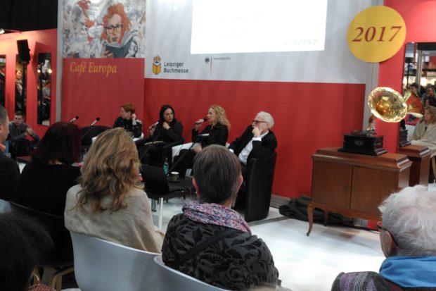 Das Nachdenken in den Messehallen ist bei dem gewohnten Lautstärkepegel schwierig. Dennoch wagen es einige Veranstaltungen, genau darauf abzuzielen. So auch eine Diskussion im „Café Europa“. Das Thema lautet „Wer ist das Volk?“ Katja Riemann beschreibt in einer kurzen Eingangsrede, dass der Begriff „Volk“ in Deutschland zunehmend als Abgrenzung zum Rest der Gesellschaft genutzt wird, gerade von Populisten.