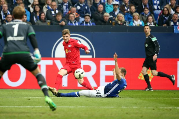 Die Gäste begannen stürmisch und liefen das Tor von Schalke 04 gleich in der ersten Minute mit hohem Tempo und enormer Aggressivität an. Einen Freistoß aus 20 Metern setzte Forsberg deutlich übers Tor (7.). Den ersten Erfolg brachte dann eine Flanke in den Strafraum, die ausgerechnet Werner per Kopf zum frühen 1:0 vollendete (14.). Der RBL-Angreifer hatte im Hinspiel mit einer Schwalbe einen Elfmeter verursacht und war in den folgenden Wochen von Medien und gegnerischen Fans massiv angegriffen worden.