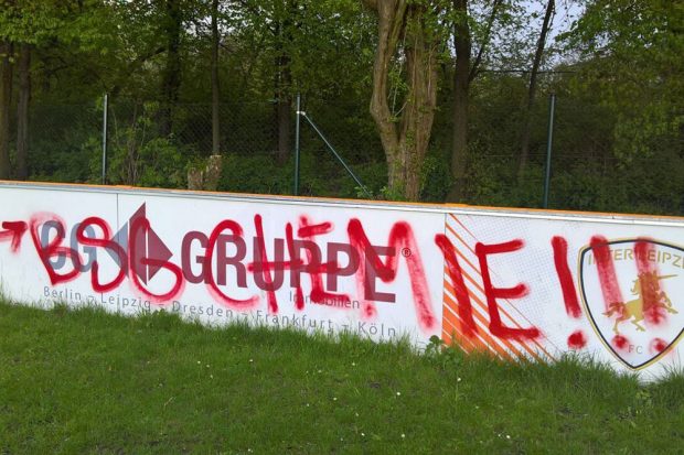 Wer sich bereits vor dem Brand auf dem Gelände des FC Inter Leipzig und danach vor Ort umschaute, konnte nicht nur einen neuen Sozialcontainer vor dem Brand sehen. Auf dem Containerbau und an den Banden der Sponsoren rings ums Spielfeld fanden sich Graffiti, welche auf einen weiteren Sportverein in Leipzig hinweisen. Dies zeigen Bilder, die der L-IZ seit Samstag vorliegen. Bereits zu Ostern, also etwa eine Woche vor dem Brandanschlag vom 21. April 2017 gegen 2:45 Uhr, hatten sich Unbekannte offenbar längere Zeit auf dem Gelände zu schaffen gemacht. Und Schriftzüge hinterlassen, die durchgängig auf die BSG Chemie verweisen sollen.