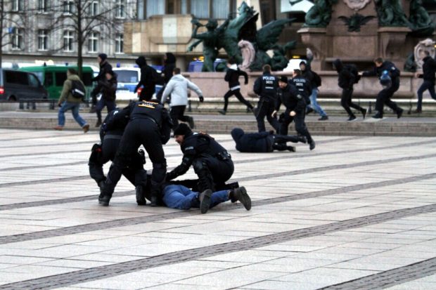 Im Polizeideutsch klingt dass dann so: „Zudem versuchten sie, die Polizeiabsperrungen am Augustusplatz zu überwinden. Um dieses Verhalten zu unterbinden, war der Einsatz von unmittelbarem Zwang unumgänglich.“