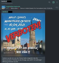 Heute scheint kein guter Tag für die sogenannten „Querdenker“ zu sein. Nach einer ersten Mitteilung der Anmelderin für die gleichartige Demonstration ab 16:30 Uhr auf dem Hallenser Marktplatz auf Telegram hat die Stadt Halle mit sofortiger Wirkung auch diese Kundgebung verboten.