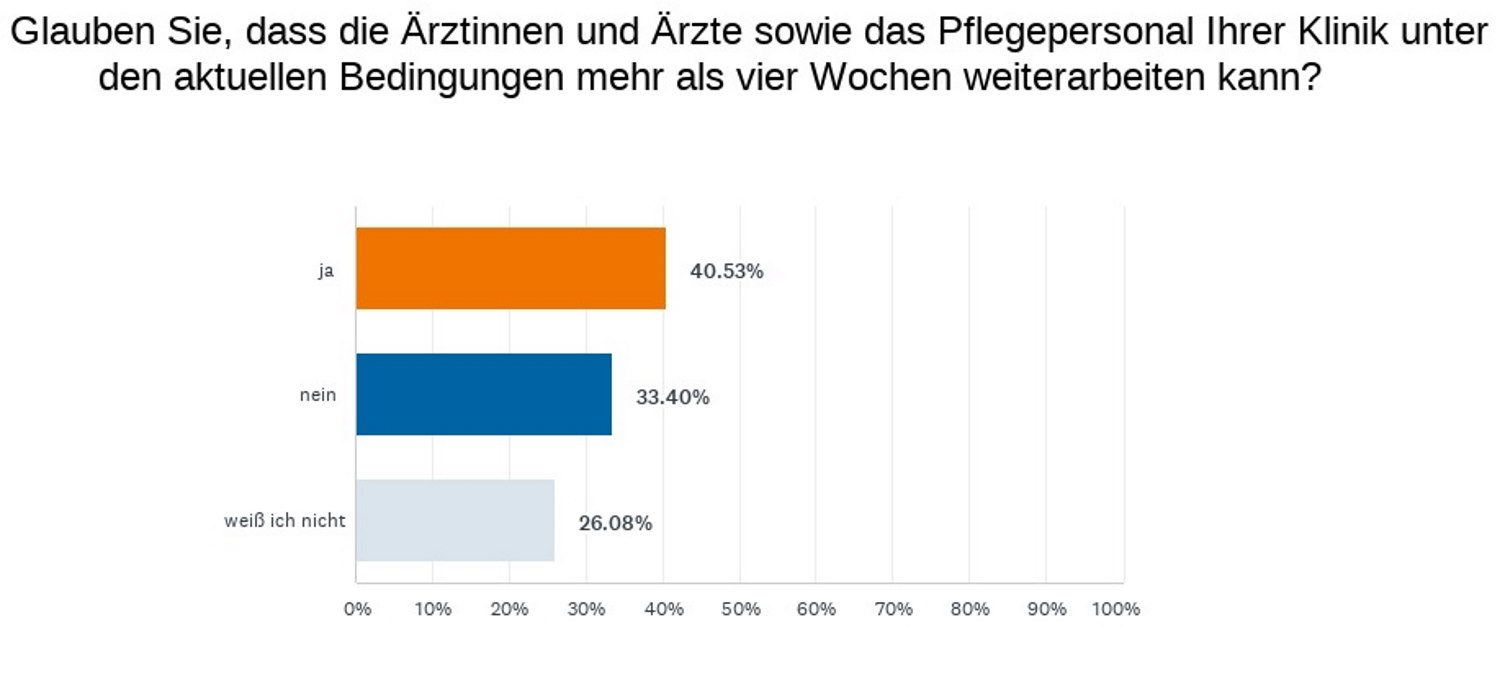 33 Prozent der Befragten glaubt nicht, dass die Ärztinnen und Ärzte sowie das Pflegepersonal ihrer Klinik unter den aktuellen Bedingungen mehr als vier Wochen weiterarbeiten kann. Nur 41 Prozent glauben, dass das möglich sei.