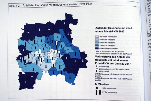 Und die beigegebene Karte zeigt dann noch etwas, dass nämlich der Pkw-Besitz im vom ÖPNV besser erschlossenen Innenstadtbereich sogar sinkt, während er in aufstrebende Ortsteilen in der Randlage sogar deutlich steigt – so wie in Mockau, Eutritzsch, Schönefeld, Lößnig und Seehausen.