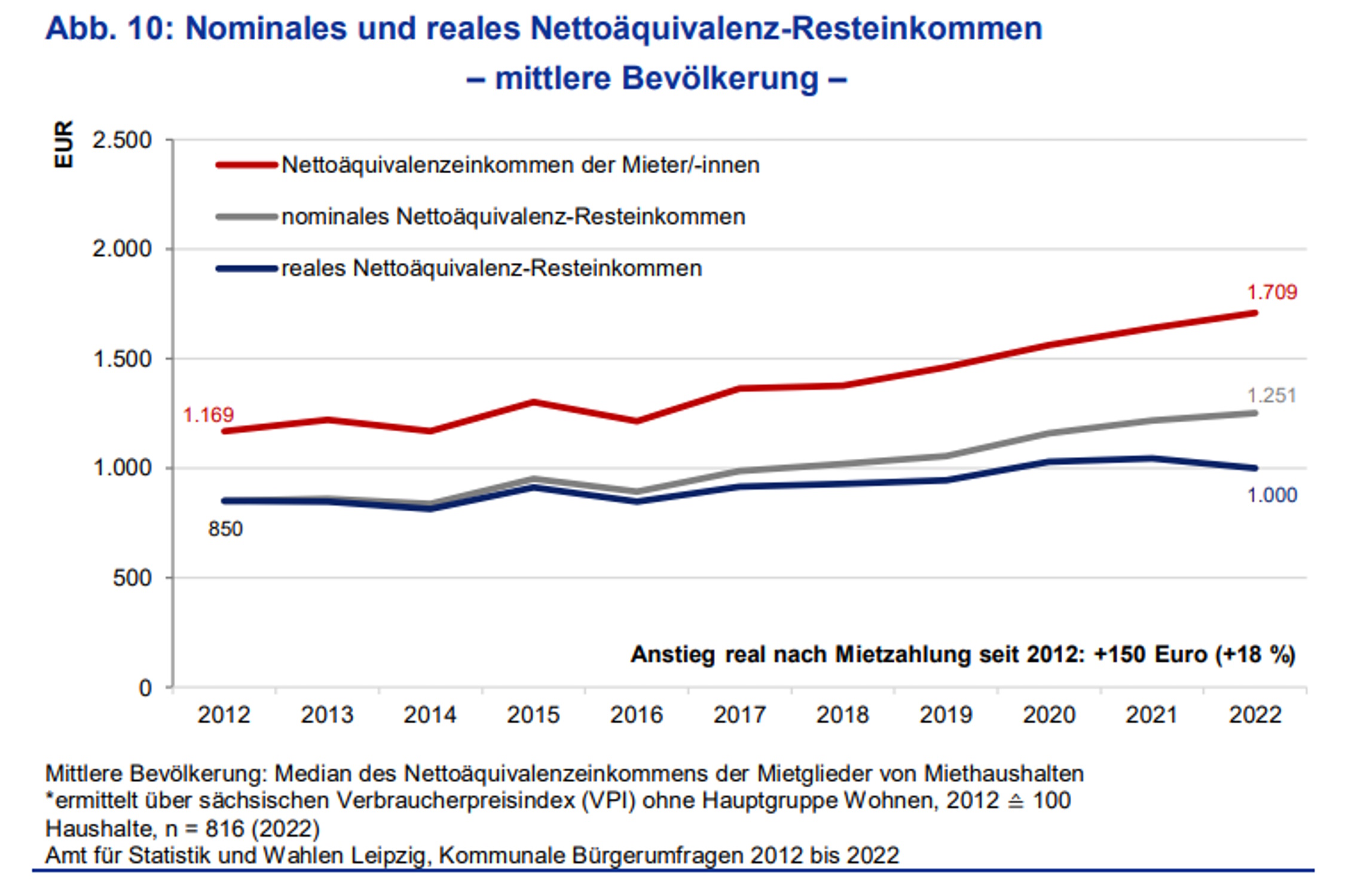 Der Beitrag des Amtes für Statistik und Wahlen untersucht entsprechend das so genannte „reale Nettoäquivalenz-Resteinkommen“, das bei Mieterinnen und Mietern in Leipzig von 1.045 Euro im Jahr 2021 auf 1.000 Euro im Jahr 2022 gesunken ist. Für Städte- und Regionalvergleiche und um gegebenenfalls wohnungsmarktpolitische Instrumente zu etablieren, sollte jedoch nicht nur das Resteinkommen, sondern auch die jeweilige Haushaltsgröße berücksichtigt werden: Wohnen mehrere Menschen gemeinsam, können sie auch einige Produkte und Waren des täglichen Bedarfs gemeinsam nutzen und somit sparen. Zudem beeinflusst die Inflation der sonstigen Verbraucherpreise die soziale Situation der Mieterinnen und Mieter.