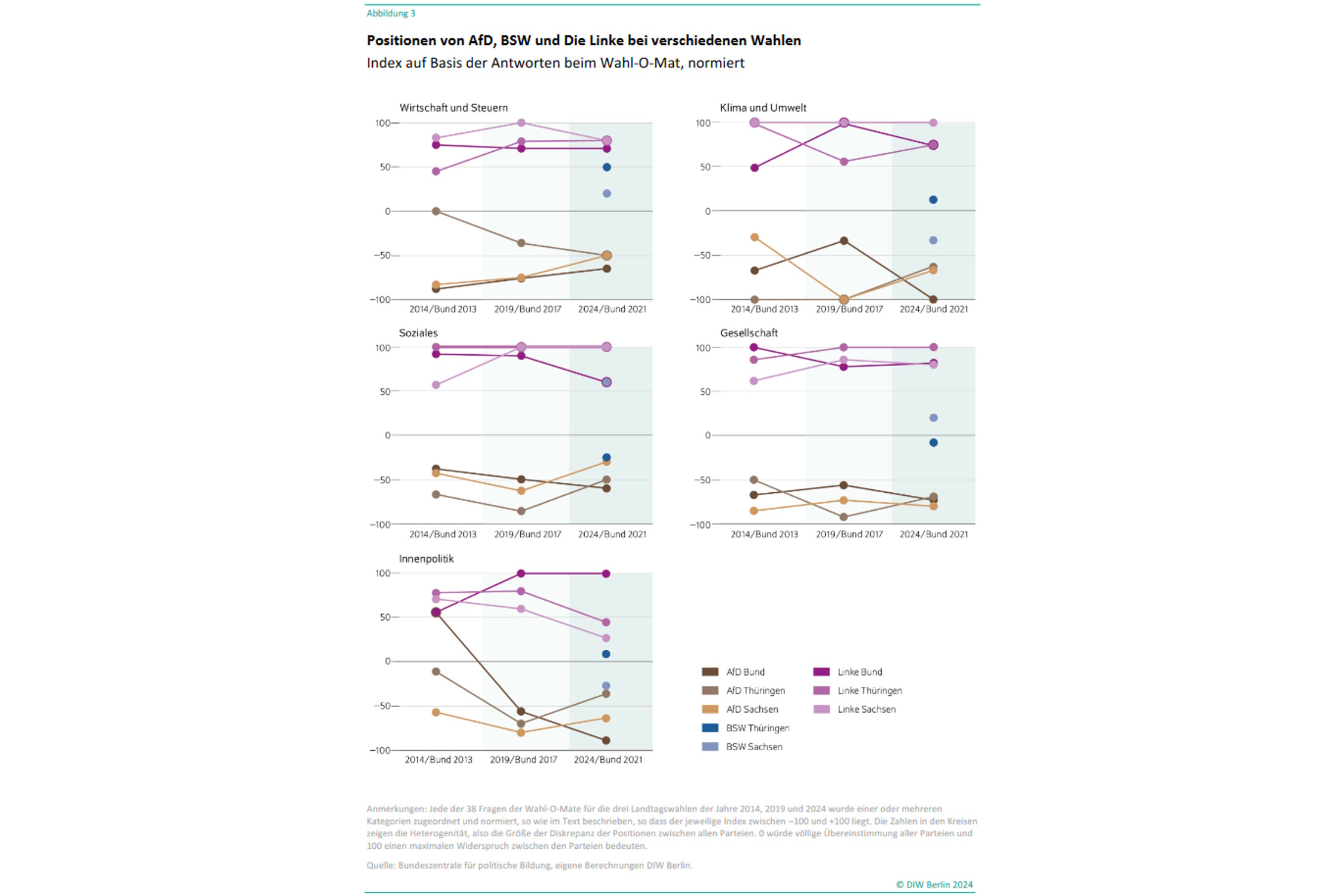 Dieses „DIW aktuell“ hat die Positionen von AfD und BSW für die Landtagswahlen in Thüringen und Sachsen auf Basis des Wahl-O-Mats der bpb analysiert. Es zeigt sich, dass die AfD sich über die Zeit stark radikalisiert hat und in fast allen Politikbereichen extreme Positionen vertritt, die sich von denen der demokratischen Parteien kaum noch stärker unterscheiden könnten.