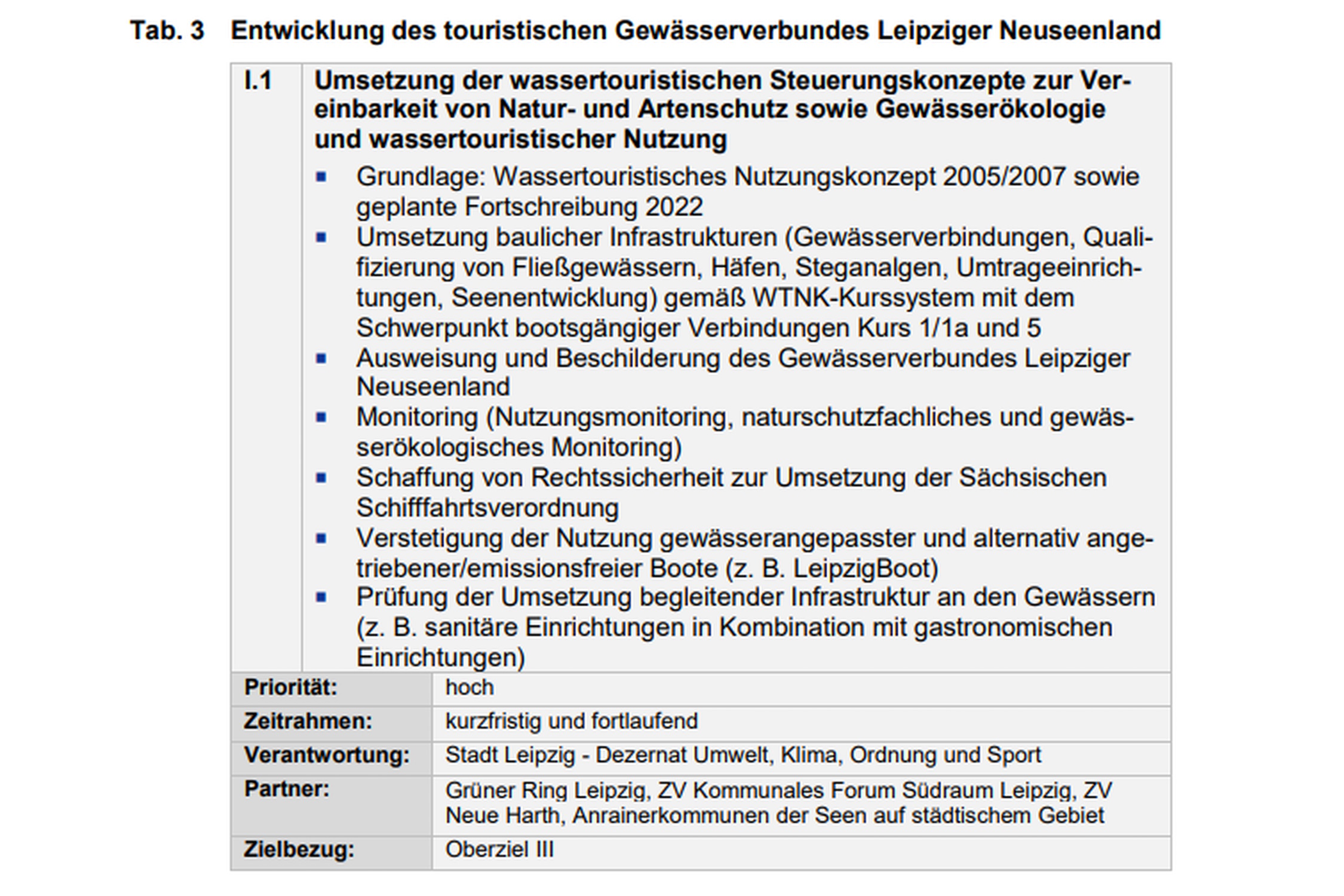 Zu vermeiden ist jedoch die Schaffung von Tatsachen, speziell im Bereich des Wassertourismus, die einer naturnahen Entwicklung und dem Schutz des Leipziger Auwaldes entgegenlaufen. Insbesondere müssen die Maßnahmen in Bezug auf das Auenentwicklungskonzept reversibel sein. Umweltschutz hat an dieser Stelle Vorrang vor wirtschaftlichen Interessen.“