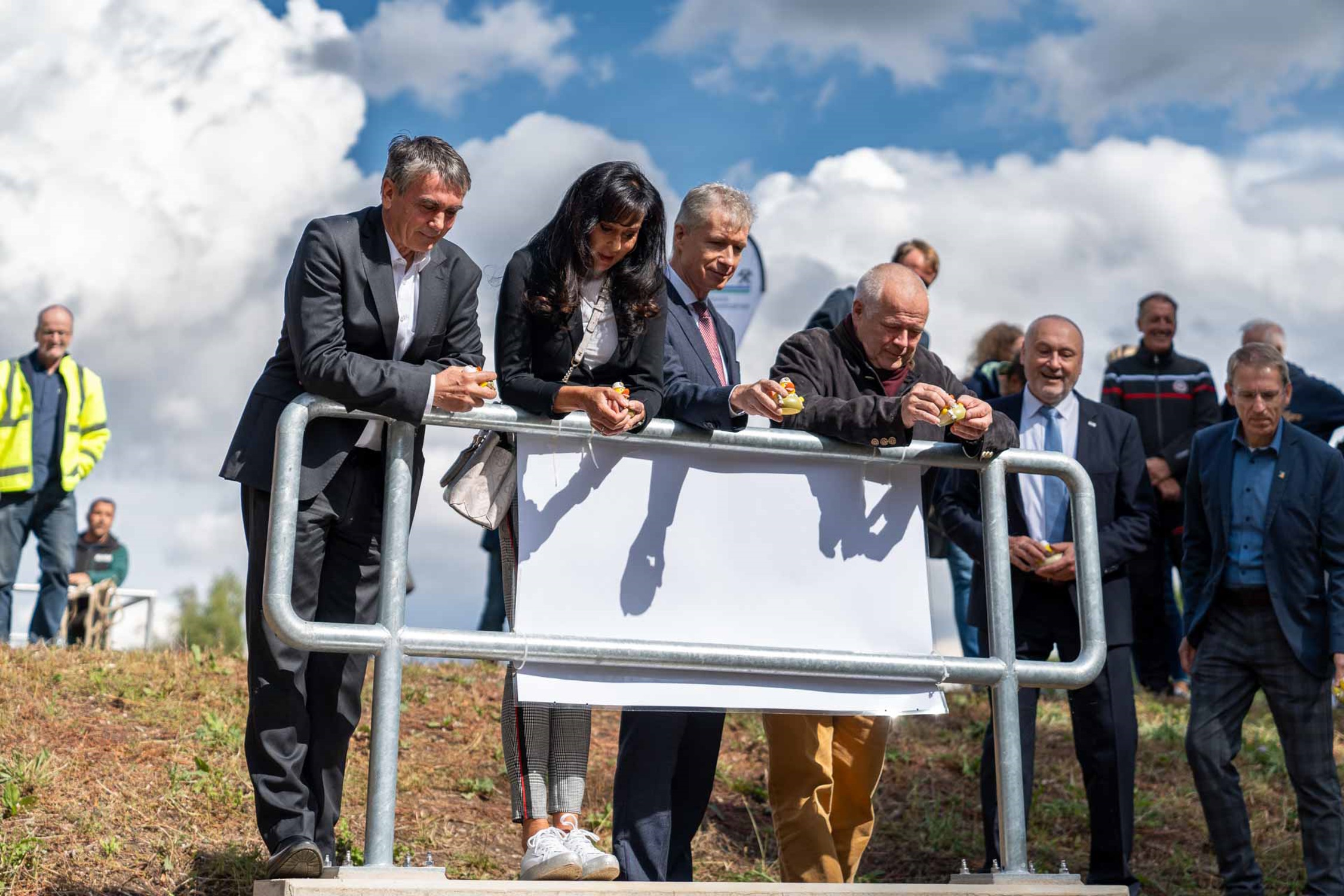 Bernd Sablotny, Sprecher der Geschäftsführung der Lausitzer und Mitteldeutschen Bergbau-Verwaltungsgesellschaft mbH (LMBV), begrüßte aus diesem Anlass zahlreiche Gäste aus Ministerien und Ämtern, der beteiligten Baufirmen, den Bürgermeister sowie Bürger der Gemeinde Schkopau.