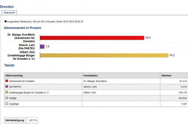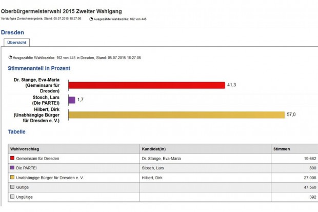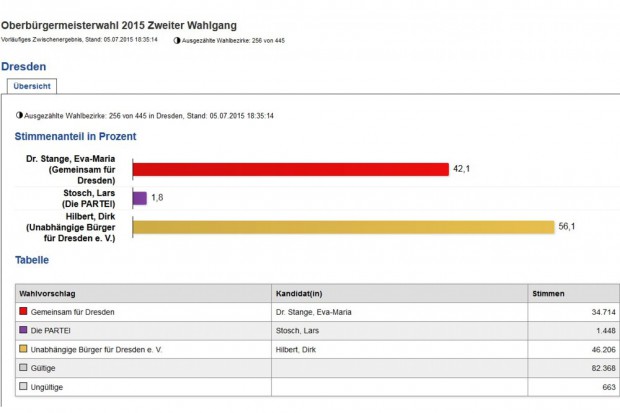 Im Sachsenspiegel kann man sich dann wohl live das enttäuschte Gesicht der amtierenden Staatsministerin Eva-Maria Stange anschauen. Denn heute wird es nichts für die gemeinsame Kandidatin von Rot-Rot-Grün plus Piraten in Dresden. Wie vorausgesagt musste sich der Trend zur ersten Wahl drehen, da alle Kandidaten, welche am 7. Juni noch Hilbert Stimmen kosteten, für den zweiten Gang zurückzogen. Doch nach 394 Wahlbzirken ist klar – Dirk Hilbert (FDP) wird neuer Oberbürgermeister in Dresden.