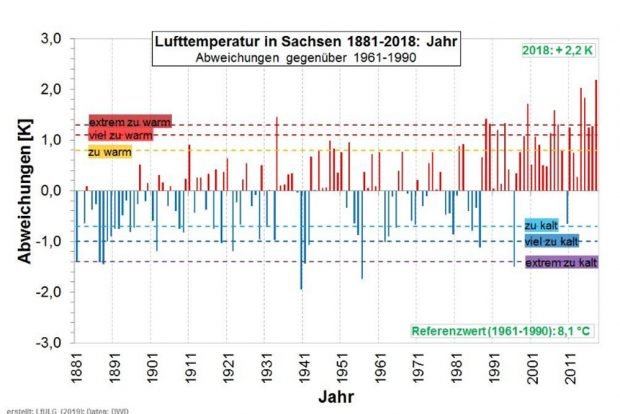 Danach war das Jahr 2018 mit einer Abweichung von +2,2 Grad das wärmste und mit minus 33 Prozent eines der beiden niederschlagsärmsten seit 1881 in Sachsen. Ebenso zählt es mit +31 Prozent zu den beiden sonnenreichsten Jahren seit 1951.