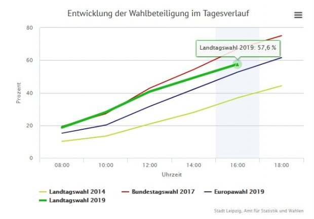 Nun ist es also sicher – die Wahlbeteiligung wird zumindest in Leipzig deutlich über der von 2014 landen. Ganze 13,3 Prozent lag sie bei den vorläufigen Zahlen schon 16 Uhr in Leipzig über dem Wert der letzten Landtagswahl am Ende. Da gingen nur 44,3 Prozent der Sachsen überhaupt wählen. Leider liegen solche Zahlen ab sofort bis nach der Wahl nur noch für die größte Stadt Sachsens vor. In der Landeshauptstadt Dresden werden weitere Beteiligungszahlen erst 18 Uhr herausgegeben, Chemnitz sieht einen solchen Service nicht vor.