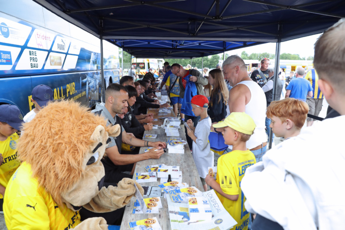 Schon lange, bevor überhaupt auch nur ein Lok-Kicker zu erspähen war, bildete sich eine rund 100 Meter lange Schlange vor Bühne und Autogramm-Tisch. Doch ehe die Spieler ihre Stifte über Autogrammkarten, Fotos, Schals, Trikots, Bälle und sonstige Devotionalien kreisen ließen, wurde jeder einzelne von ihnen auf die Bühne geholt und den Fans vorgestellt – mancher Schmunzler und großer Applaus inklusive.