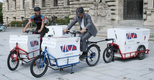 Und dann gibt es noch die schnellen Kurierfahrten innerhalb der Stadt, wenn Schriftstücke nicht bis zum Sammeltransport am anderen Morgen warten können. Da sind dann Radkuriere mit gewohntem Rucksack unterwegs und kommen dabei schnell mal auf 20, 30 Kilometer in den Beinen.