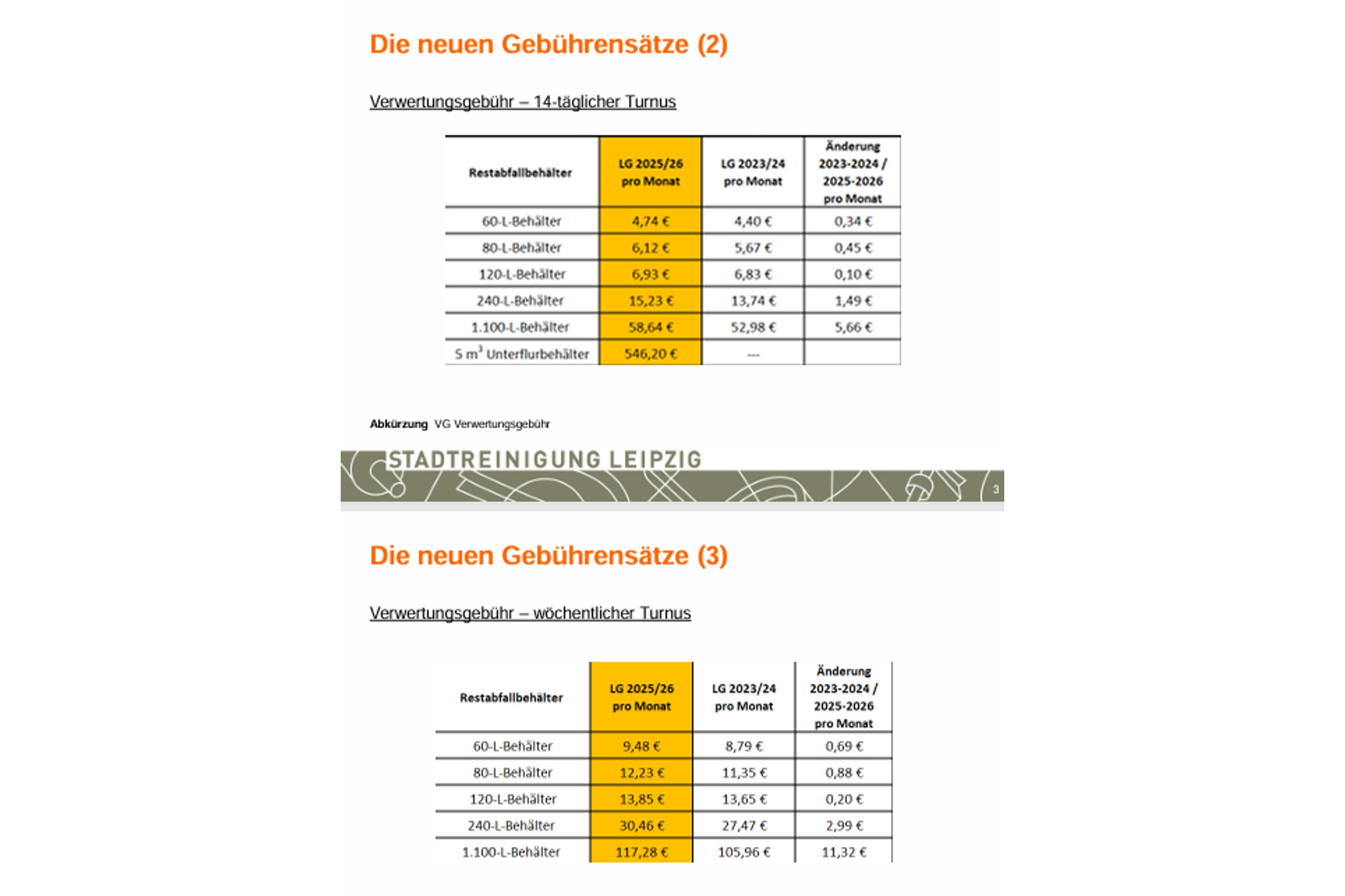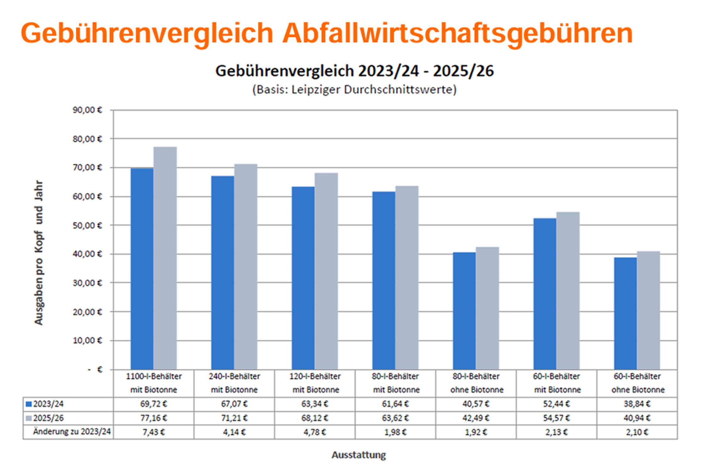 Die Leerungsgebühr für Restabfallbehälter erhöht sich je nach Behältergröße um 0,48 bis 4,35 Euro pro Leerung. Die monatliche Verwertungsgebühr für eine reguläre 14-tägliche Leerung steigt je nach Behältergröße um 0,10 bis 5,66 Euro. Ein wöchentlicher Entsorgungsrhythmus ist auf Antrag ebenfalls möglich und führt zu einer Verdopplung der Festgebühr.