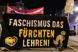 Es mag ja hier und da umstritten sein, wenn antifaschistische Bewegungen ein wenig Glitter auflegen, sich die Gesichter schminken oder ein Kopfkissenbezug zur Gespensterverkleidung wird. Den 200, die heute ab 16:30 Uhr von der HTWK bis auf den Leipziger Augustplatz zogen, schien es Spaß zu machen, den mitlaufenden Kindern ebenfalls. Spuk auf Rechts erlebte seine zweite Auflage und blieb, wie zu erwarten war, natürlich allseits friedlich. Während die Polizei die Kreuzungen jeweils kurz freihielt, dröhnte es auf der Karl-Liebknecht-Straße und im Zentrum „No Nations, no Border“ und „Nazis raus“. Auf den Zwischenkundgebungen ging es unter anderem um das „Haus“ der Identitären Bewegung Halle.