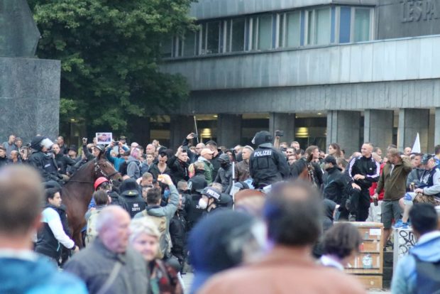 Was immer etwas seltsam ist, sind vor allem junge Journalisten-Kollegen von solchen Formaten wie „Buzz-Feed“ oder anderen „Hier-ist-es-geil“-Formaten, die sich mitten in eine Neonazi-Demo oder in einen Polizeieinsatz hineinstellen und dann selbst zum Gegenstand der Berichterstattung werden: Ich hab was abbekommen vom rechten Fußball-Hooligan. Bilder, die Eindruck machen, aber eben auch inmitten einer jagenden Orka-Herde gelingen dürften. Gegen 19:30 Uhr entwickelt sich am 1. September etwas, was man als ein Durcheinander mit Räumpanzer und Wasserwerfer bezeichnen könnte. Die Lage wird jedenfalls schnell unübersichtlich.