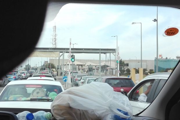 Beseelt vom Treffen mit Ismail Khatib macht sich unsere Reisegruppe bereit für die Rückfahrt ins israelische Kernland Richtung Südwesten nach Netanja. Uns stehe nur noch der Checkpoint bei der Ausfahrt aus dem Westjordanland bevor, grinst mir mein arabischer Begleiter Salam zu. Gegen 16 Uhr langen wir dort an. Blutjunge israelische Sicherheitsmädchen in leuchtendem Gelb – ich schätze sie auf 18 oder 19 Jahre – empfangen uns mit barscher Stimme und bestimmendem Gestus – Name, Passport, Alter, Beruf.