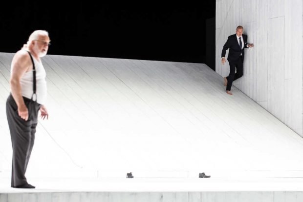 Der Katalane steckt „Moses und Aron“ in einen großen weißen Holzkasten, der die gesamte Bühne einnimmt. Der Chor singt im ersten Akt von den Seiten und aus dem 4. Rang. Auf der Bühne tragen Ryan und Tomlinson, beide darstellerisch und stimmlich dauerpräsent, den Zwist der ungleichen Brüder aus.