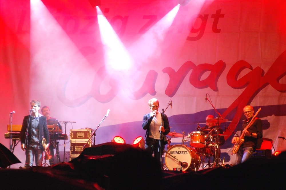 Darauf wollte ich jetzt zu sprechen kommen. In der Band unterhalten wir uns sehr wohl, was im Land, was in Europa und weltweit passiert. Der eine ist auf einer Reise in Chile unterwegs gewesen, kommt zurück, ein anderer ist in der Ukraine gewesen: und dann unterhalten wir uns eigentlich mehr darüber, wo wer war und was er da erlebt hat. Und wenn wir dann eine Einladung bekommen zu „Leipzig zeigt Courage“, dann gibt es einen demokratischen Konsens in der Band und wir sagen ja.