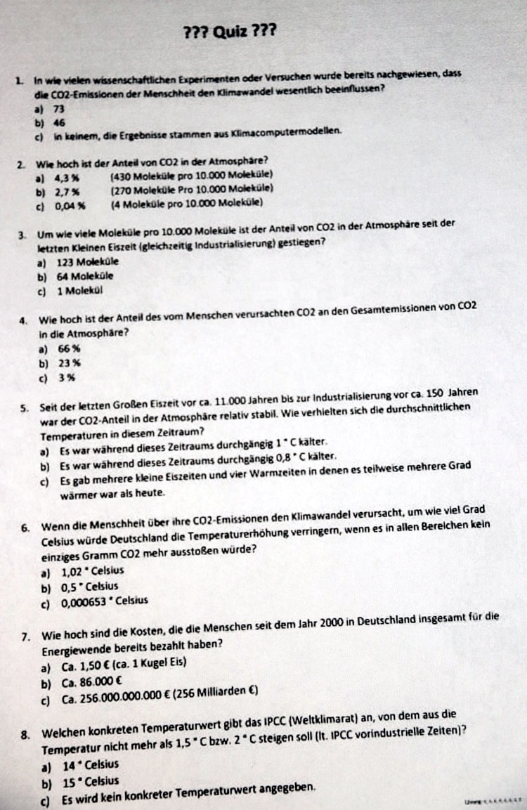 Nun folgt das Quiz, welches die Aussagen von Wilke und anderer Leugner des menschlichen Anteils am Klimawandel untermauern und offenbar auf den kommenden „Fridays for Future“-Demonstrationen verteilt werden soll. Laut dem Ex-Volkspolizisten Karsten Hilse (AfD) soll es „den Schülern dazu dienen (…), ihr eigenes Wissen in Naturwissenschaften zu überprüfen.“