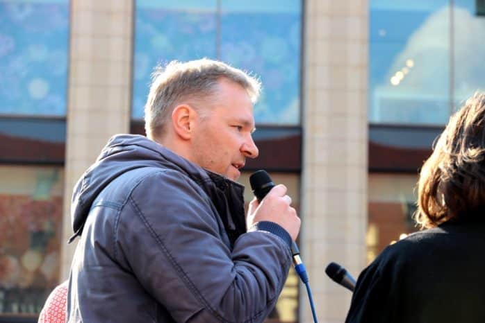 Video L-IZ.de. Das Video entstand am 6. April 2019 auf dem Leipziger Marktplatz. Während der Demonstration sollten die Leipziger Stadträte, (vlnr.) Mathias Weber (Linke), Tim Elschner (Grüne), Christopher Zenker (SPD) und Ute-Elisabeth Gabelmann (Piraten, Freibeuterfraktion) zur Frage Stellung nehmen, wo ihre Parteien die Fehler in der Vergangenheit und die Lösungsansätze für die Zukunft bei der Mietenentwicklung in Leipzig sehen. Laut Veranstalter hatte die CDU nicht auf die Anfrage zum Gespräch reagiert.