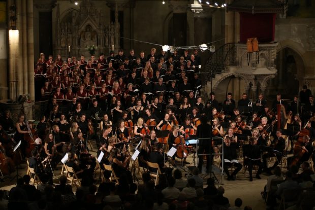 Eine orangefarbene Rettungsweste an der Kanzel schlägt die Brücke in die Gegenwart. „Ich finde es wichtig, über Krieg nachzudenken, auch musikalisch“, erläuterte Universitätsmusikdirektor David Timm zu Beginn der Aufführung die Werkauswahl. Während sich im Mittelmeer humanitäre Tragödien abspielen, setzen Universitätschor, Universitätsorchester und MDR-Kinderchor mit der Aufführung des modernen Klassikers ein Zeichen gegen Krieg, Flucht und Not.