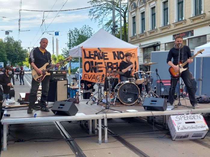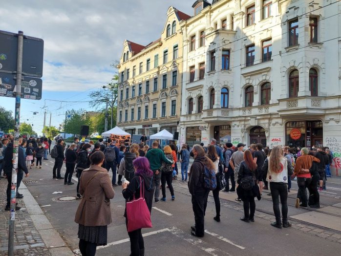 Zudem hatte sich am Samstag auch viel Protestpotenzial auf der Wolfgang-Heinze-Straße in Connewitz gesammelt. Unter dem Motto „Leave No One behind“ („Lasst niemanden zurück“) hatten sich seit dem Vormittag hunderte Menschen friedlich versammelt, um neben den Folgen der Pandemie auch auf die prekäre Situation geflüchteter Menschen an den Außengrenzen der EU aufmerksam zu machen.