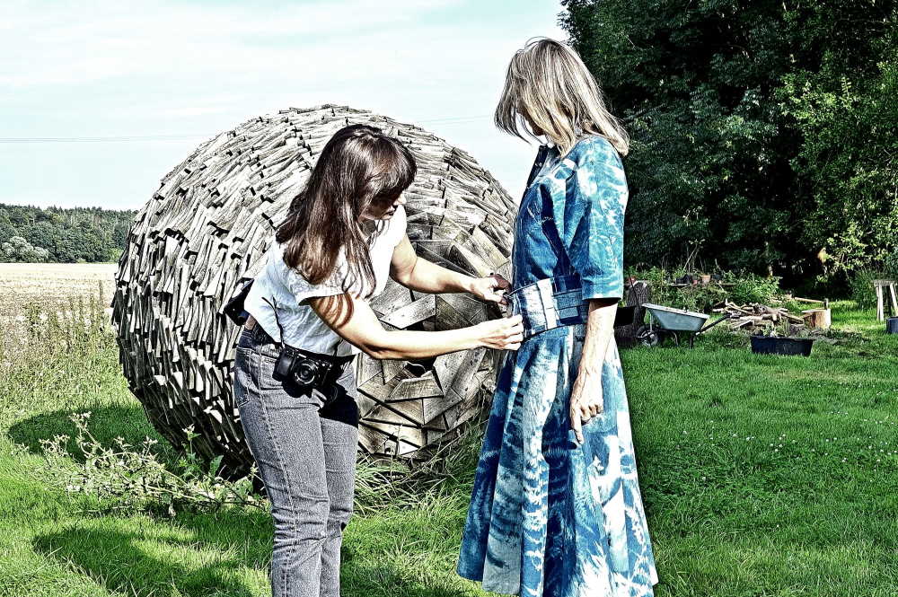 Klara Meinhard arbeitet und experimentiert mit der Belichtung verschiedener Materialien. Sie belichtet Stoffe wie ein Foto und nutzt die Natur als Helfer in der Kunst und macht dabei auch Erfahrungen, die sie in der Stadt nur schwer hätte realisieren können. Mit einer Belichtungstechnik, die schon älter als die uns heute bekannte Fotografie ist, bringt sie Blätter und andere Objekte als Abbild auf Stoffe, mit denen sie später modische Kleider schneidert, von denen jedes ein Unikat ist.