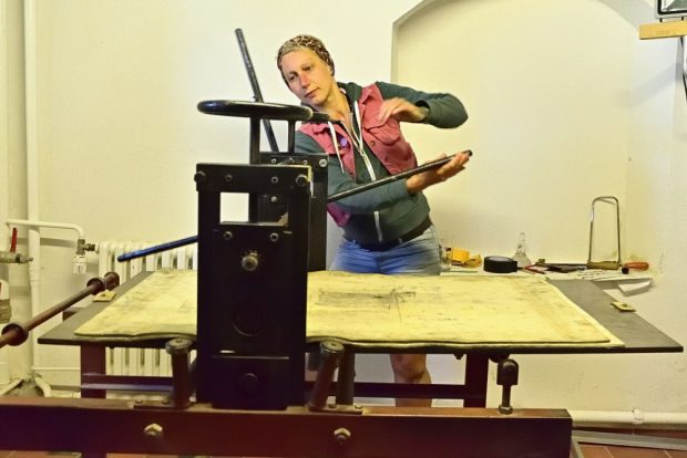 In der Druckerei findet man hinter der Druckerpresse den Grafiker Marc Dettmann. Mit einer Fototechnik hat er ein real existierendes Graffiti mit der Aufschrift „Eure Buden sind Vandalismus“ auf eine Druckerplatte übertragen, die Strukturen in einem Ätzverfahren herausgearbeitet und überträgt dieses Bild mittels Druckerpresse auf zuvor geschaffenen Aquarelle, sodass mit einem Hauptmotiv unzählige Unikate entstehen.