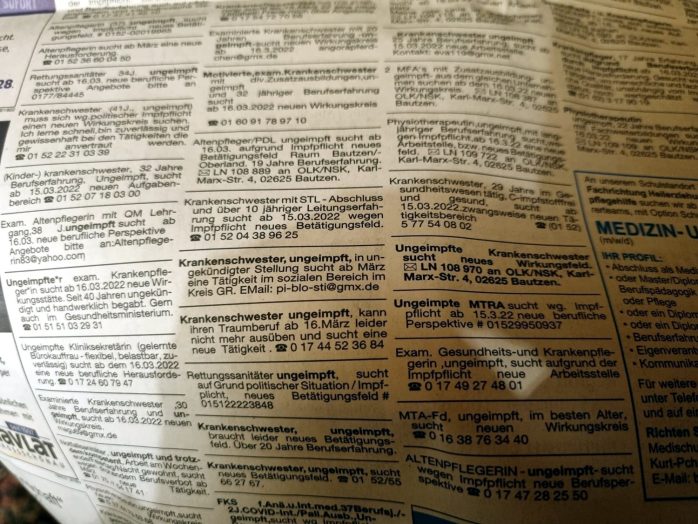 Die erste Reaktion war "krass!", als mir das Anzeigenblatt aus #Bautzen in die Hände fiel, 126 Stellengesuche, #Ungeimpfte aus dem Gesundheitswesen suchen dringend Alternativen – wird eine #Impfflucht das System lahmlegen? Ich hab mal begonnen zu telefonieren… pic.twitter.com/QrZbCSWZXa