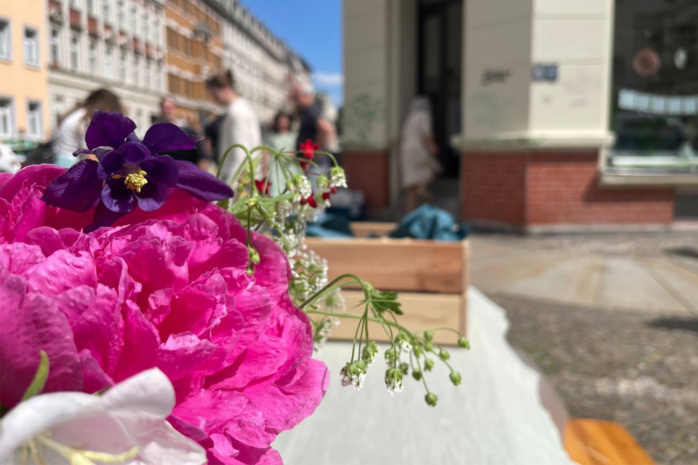 Eine bunte Traube an Menschen tummelt sich bei schönstem Sonnenschein am Sonntagnachmittag an der langen Tafel, die vor dem kleinen Eckladen in der Kochstraße/Ecke Steinstraße aufgebaut ist. Der Tisch ist geschmückt mit salbeigrünen Decken, Kerzen, Blumen, Kuchen und Obst, die Stimmung gelöst und wohlwollend.