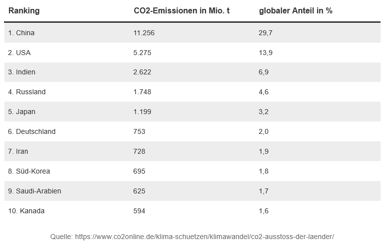 Reden wir lieber über Deutschland und die deutsche Wirtschaft, besonders über den CO₂-Ausstoß und das lang kommunizierte Framing „Deutschland kann die Welt nicht retten!“. Besonders wenn gern der Einwand „Aber China“ gebracht wird: baut Kohlekraftwerke, emittiert viel mehr CO₂ und „Was bringt es global, wenn wir den CO₂-Ausstoß verringern?“.