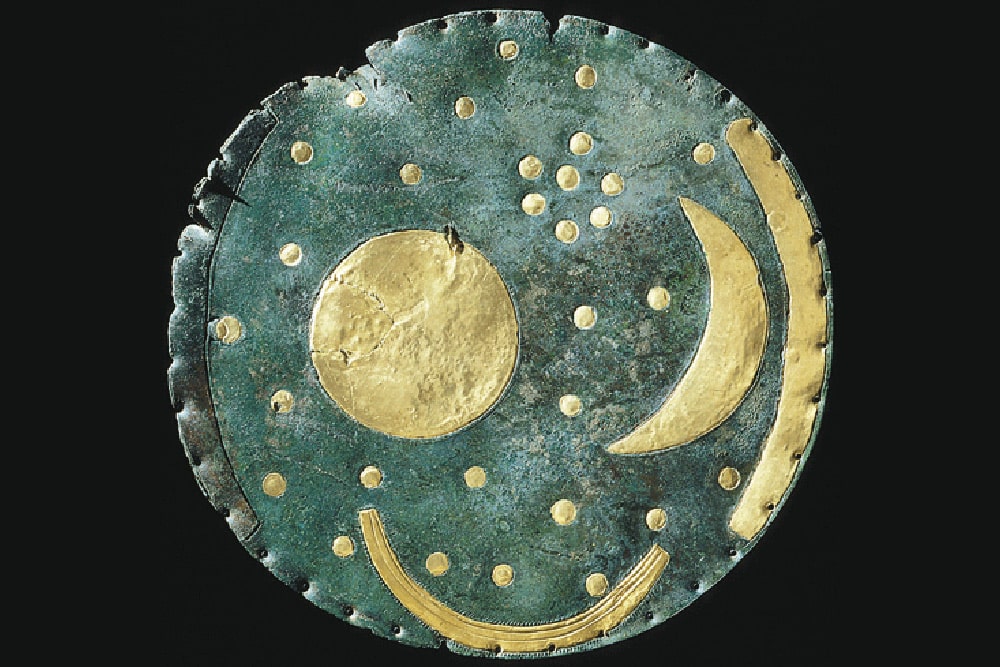 Denn die Scheibe ist tatsächlich komprimiertes astronomisches Wissen. Aber solches, das im schriftlosen Mitteleuropa kaum zu gewinnen war. Deswegen scheint auch hier eine Beziehung zum fernen Zweistromland nahezuliegen. Und der Leser beschäftigt sich mit den beiden Autoren gemeinsam mit einer Sternengruppe, nach der man sich am heutigen lichtverschmutzten Himmel oft vergeblich den Hals verrenkt: den Plejaden. Die spielen in den babylonischen Mythen eine zentrale Rolle. Und sie sind als Siebengestirn auf der Himmelsscheibe unübersehbar.