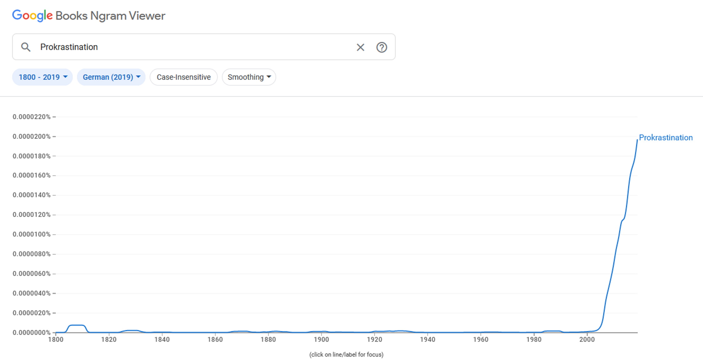 Google Ngram zeigt sehr deutlich auf, ab wann Prokrastination zum Problem der „Leistungsgesellschaft” erklärt wurde. Screenshot: LZ