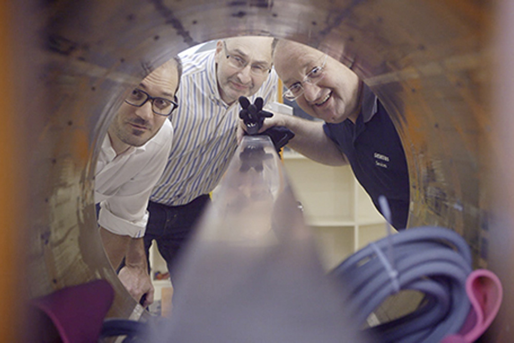 „Wir wollen auf eine Ebene von rund 0,6 Millimeter gelangen“, so Weiskopf über die von SIEMENS Healthcare entwickelte Anlage. „Damit können wir endlich einen deutlich genaueren Einblick in den nur rund drei Millimeter dünnen Cortex bekommen, der für unsere höheren kognitiven Fähigkeiten so entscheidend ist. Vielleicht erreichen wir sogar eine Größenskala, auf der sich zwischenmenschliche Unterschiede erklären lassen.“