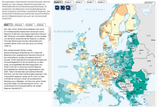 Thilo Lang und Stefan Haunstein gehen in ihrem Beitrag „Wachsende regionale Polarisierung in Europa“ genau auf dieses Thema ein. Und wer die Karte im Nationalatlas betrachtet, sieht, warum der Brexit Großbritannien zerreißt und gerade Länder wie die Visegrad-Staaten (Polen, Ungarn, Slowakei, Tschechische Republik) so leicht zum Tummelplatz nationalistischer Bewegungen wurden. Denn ein anhaltend niedriges Wirtschaftsniveau mit weiten, vom Aufschwung regelrecht gemiedenen Regionen, ist der gefundene Tummelplatz für alte, nationale Lösungsmodelle.