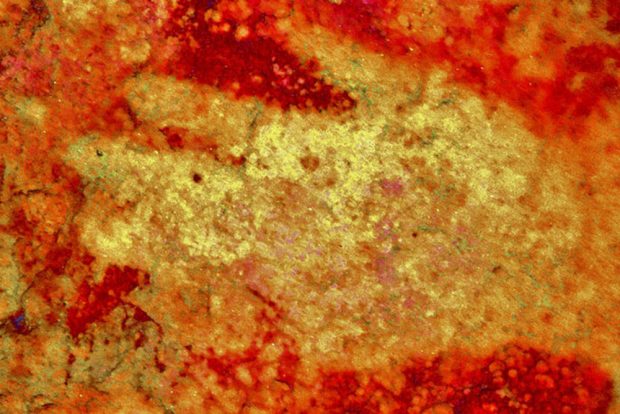 Diese frühe Höhlenkunst aus roten Farbpigmenten besteht aus Linien, Punkten, Scheiben und Handabdrücken. Dafür mussten die Schöpfer dieser Kunstwerke zunächst eine Lichtquelle planen, Farbpigmente mischen und einen geeigneten Standort auswählen.