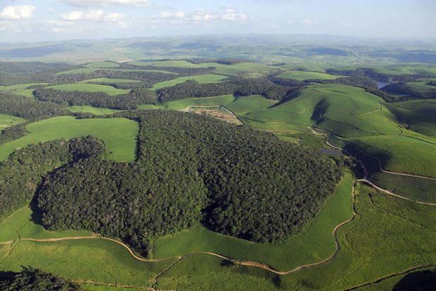 Auf dem Foto sieht das Waldstück aus, als läge es irgendwo in Mitteldeutschland. Ein paar Erhebungen, ein kleiner See, dazwischen grüne Felder. Aber was man sieht, ist der Rest eines Regenwaldes im Nordosten Brasiliens, in Mata Atlântica. Und was schon in Mitteldeutschland ein riesiges Problem für viele Tierarten ist, ist es im zerstückelten Regenwald erst recht.