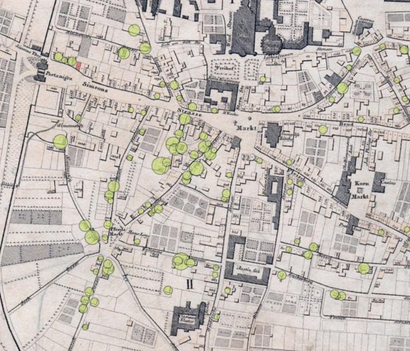 Professor Laux und seinen Mitarbeitern fielen die Armenlisten bei der Arbeit an einer Edition von Quellen zur Geschichte der Stadt Trier in der frühen Preußenzeit in die Hände. Die darin enthaltenen Angaben zu den armen Familien übertrugen sie in einen um 1845 entstandenen Stadtplan von Trier. Die nunmehr digital verfügbare Version bietet dem Nutzer Straße für Straße einen Überblick über darin lebende mittellose Familien – und vieles mehr.