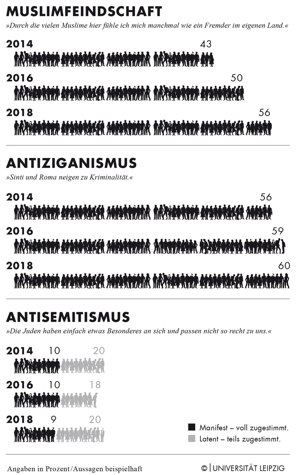 Die aktuelle Studie zeigt außerdem, dass der Antisemitismus weit verbreitet ist. Jeder Zehnte findet ausdrücklich, dass „Juden etwas Besonderes an sich haben und nicht so recht zu uns passen“, zusätzlich stimmen dieser Aussage 20 Prozent latent zu. In Westdeutschland gehen antisemitische Ansichten weiter zurück (2016: 5, 2018: 4,2). In Ostdeutschland steigen die Werte dagegen leicht an (2016: 4,1, 2018: 5,2).