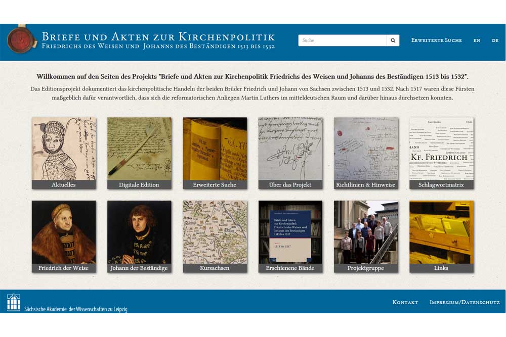 In einem Editionsprojekt an der Sächsischen Akademie der Wissenschaften zu Leipzig wird seit 2014 die Kirchenpolitik Friedrichs des Weisen und Johanns des Beständigen für den Zeitraum von 1513 bis 1532 erforscht. Nachdem 2017 der erste Band der Edition für die Jahre 1513 bis 1517 im Druck erschienen ist, sind nun alle Schriftstücke dieses Zeitraums vollständig und kostenfrei mit ihren Regesten und vielfach auch Quellentexten online verfügbar. Die digitale Aufbereitung in einer Datenbank bietet Nutzern einen großen Mehrwert: Sie ermöglicht unter anderem Volltextsuchen, das Anzeigen von Quellen und optimierte Kartendarstellungen.