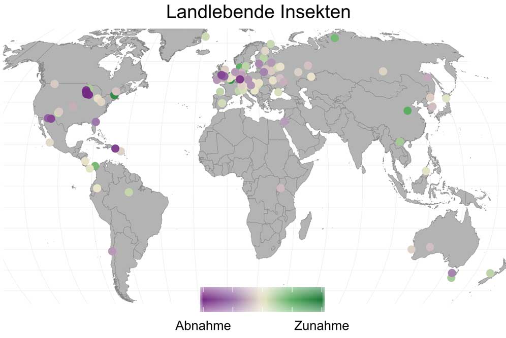 Ein internationales Forscherteam stellte Daten aus 166 Langzeitstudien an weltweit 1676 Orten zusammen, um Veränderungen der Insektenzahlen (Individuen, nicht Arten) zu untersuchen. Diese Daten wurden im Zeitraum zwischen 1925 und 2018 erhoben. Die komplexe Analyse offenbarte große Unterschiede in den lokalen Trends – selbst zwischen nahe gelegenen Orten. So gab es in Ländern mit vielen Langzeitstudien wie Deutschland, Großbritannien oder den USA sowohl Orte mit Rückgängen als auch Orte mit wenig Veränderungen oder sogar Zunahmen.