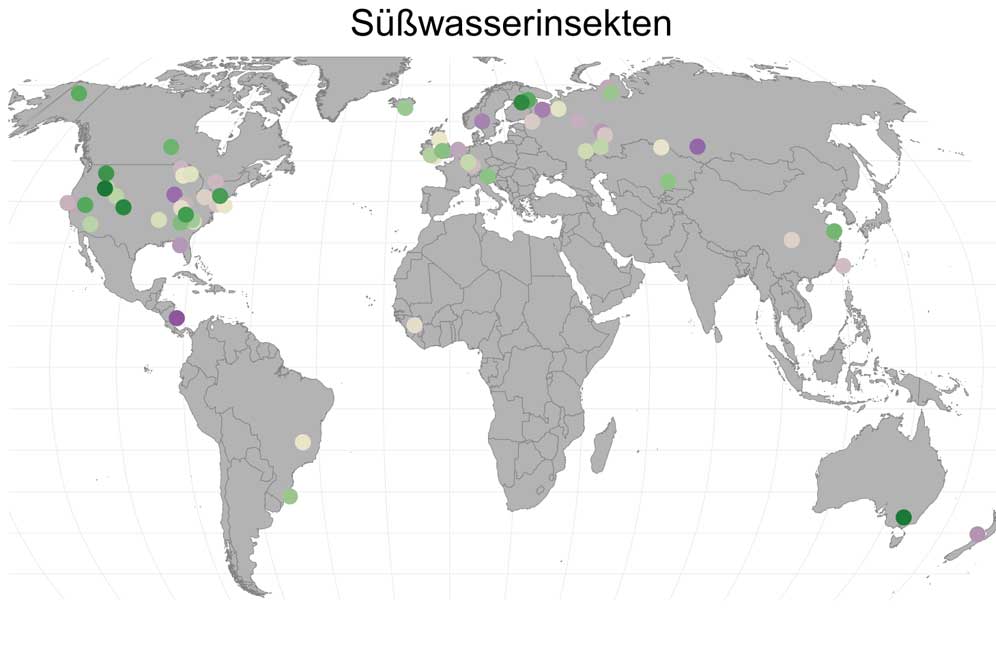 Die verschiedenen Studien zu Süßwasserinsekten. Bild: Roel van Klink. Angepasst von van Klink et al. (2020), Science. Mit Genehmigung von AAAS