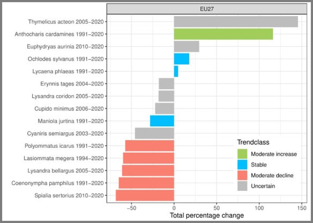 Die neusten Ergebnisse dieser Berechnungen, in die Daten aus den Jahren 1990 bis 2020 eingeflossen sind, lassen daher nichts Gutes befürchten. Die Analyse, die auch über das vom UFZ koordinierte EU-Projekt SPRING („Strengthening Pollinator Recovery through Indicators and monitoring“) mit-finanziert wurde, zeigt nur einen einzigen Gewinner: In den 27 Mitgliedsstaaten der EU kann lediglich der Aurorafalter (Anthocharis cardamines) eine Zunahme verzeichnen.