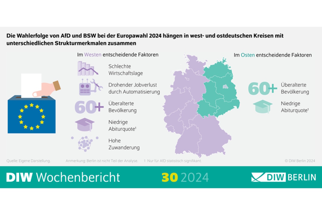 Die in Teilen vom Verfassungsschutz als gesichert rechtsextrem eingestufte Alternative für Deutschland (AfD) und das neu gegründete Bündnis Sahra Wagenknecht (BSW) erzielen vor allem in Regionen mit negativen Strukturmerkmalen Wahlerfolge: Die populistischen Parteien sind im Osten besonders in überalterten Kreisen und solchen mit niedrigem Bildungsniveau stark. Im Westen schneiden sie zusätzlich in Regionen mit niedrigen Einkommen und solchen mit vielen Beschäftigten in der Industrie, deren Jobs von zunehmender Automatisierung bedroht sind, besser ab.