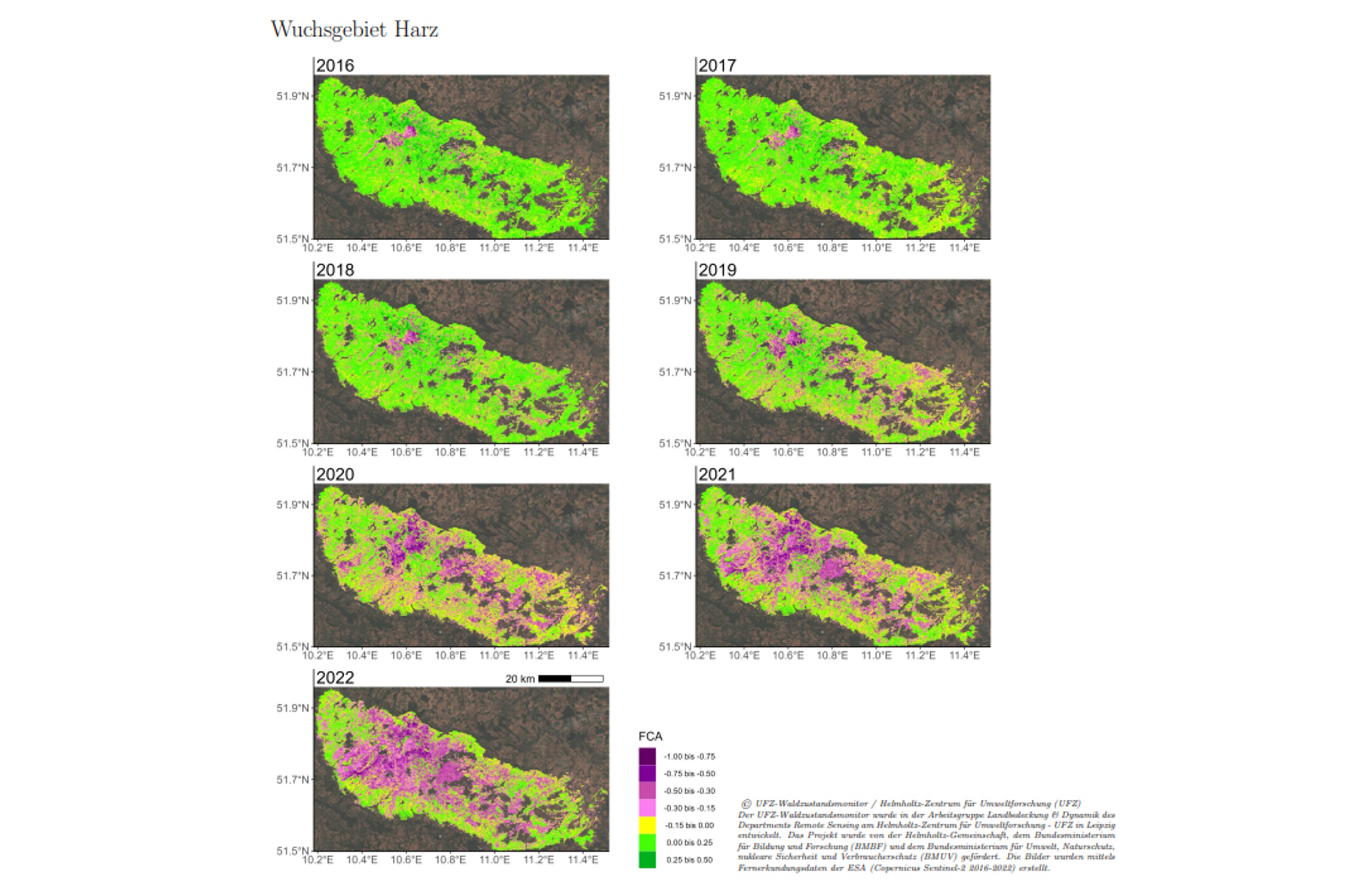 Diese Informationen sind Grundlage für den neuen UFZ-Waldzustandsmonitor, der den Zustand von Waldflächen als Karten mit einer räumlichen Auflösung von 20 Metern darstellt. Diese zeigen zwischen 2016 und 2022 vor allem für Gebiete in der Mitte Deutschlands wie Harz, Sauerland und der Sächsischen Schweiz einen deutlichen Anstieg geschädigter Waldfläche.