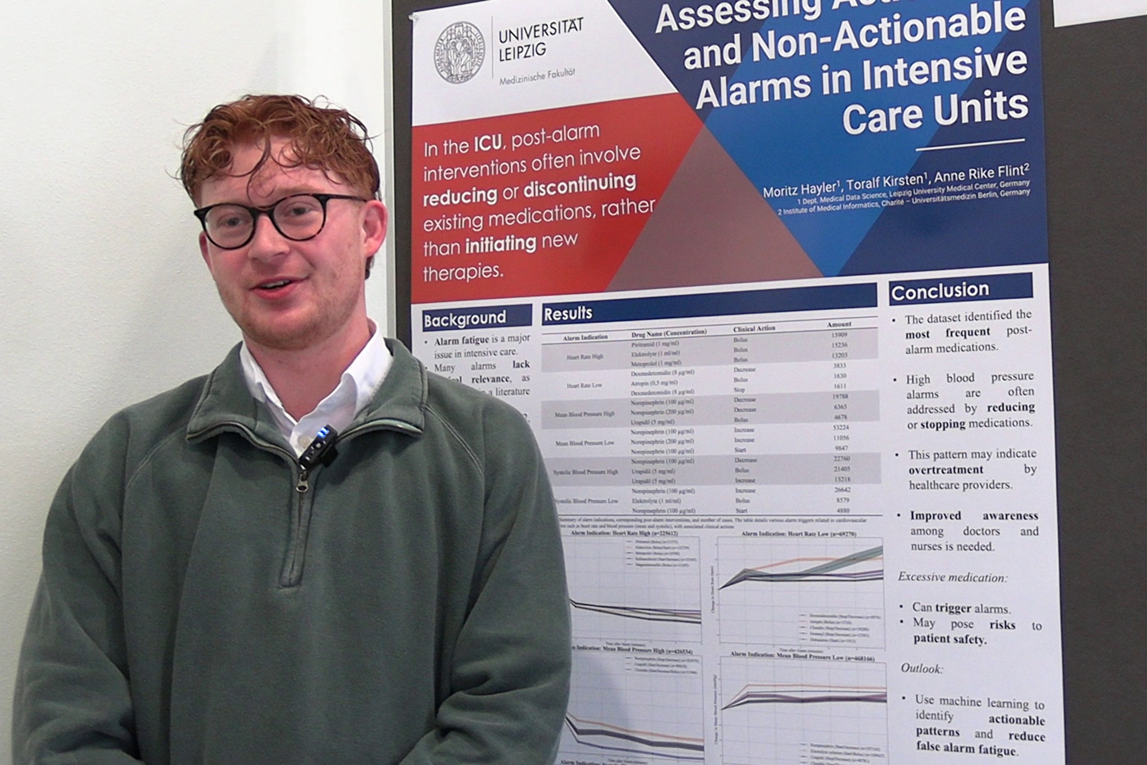 „Ich bin Moritz Hayder, ich bin Student hier an der Uni Leipzig und wir haben als Thema bearbeitet, dass wir die Alarme auf Intensivstationen, die ja viel auftreten, wo viele auch falsch sind. Das ist eine große Belastung sowohl für die Doktoren als auch für die Pflegekräfte, dass eben bei diesen Alarmen häufig keine Aktionen nachfolgen.