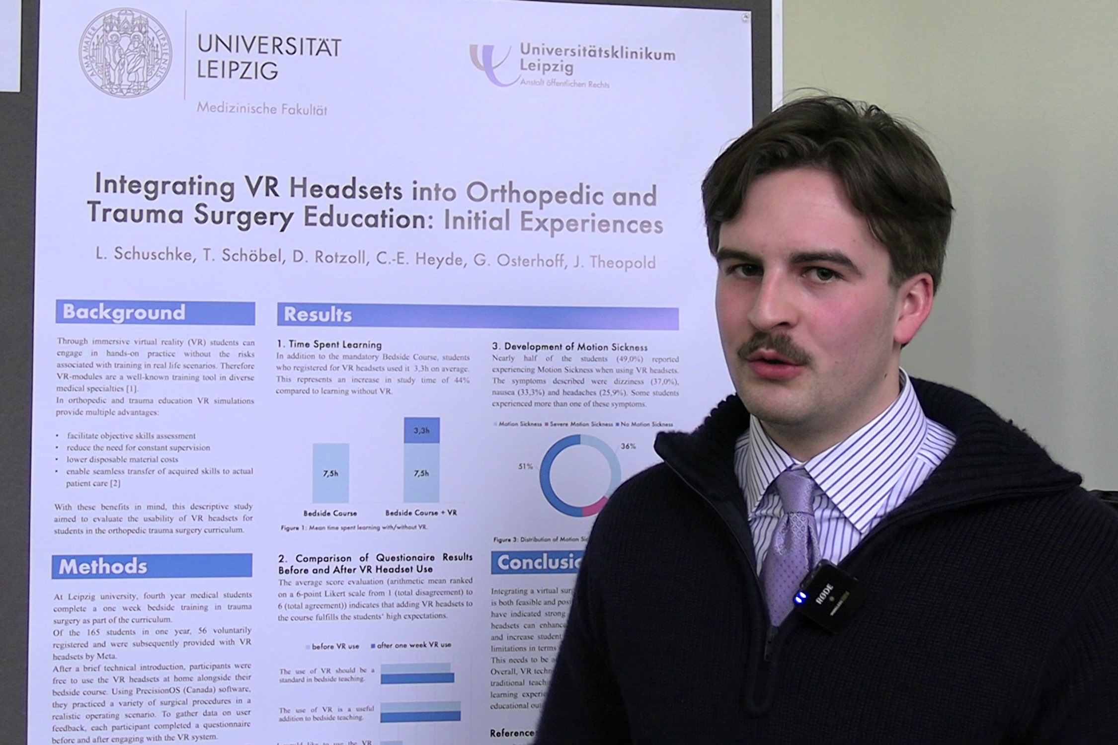 „Ich bin Leonhard Schuschke aus der Leipziger Universität und ich arbeite unter anderem mit Orthopäden und Unfallchirurgen daran, den Unterricht für Studierende motivierender und vielleicht so zu gestalten, dass es besser ist, etwas zu lernen, wenn man interaktiv neue Themen betrachtet. Und in dem Fall haben wir uns VR-Brillen genommen, in denen wir einen OP-Saal simulieren, einen virtuellen OP-Saal.